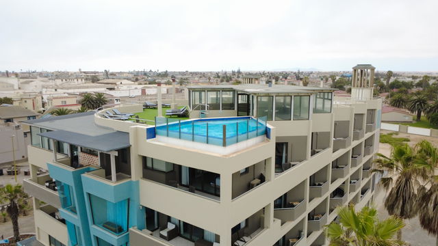 The apartment features a comfortable living area, a Smart TV with Netflix television and free wifi, a fully equipped kitchen with its own oven for travelers who wish to prepare a home cooked meal. Guests can make use of the Hotels restaurant and laundry services but this will be at your own cost. The Hotel also has a rooftop swimming pool area with the most beautiful views over the Atlantic Ocean and Namib Desert. Free Parking is available on the parking area next to the Hotel no garage or basement parking available